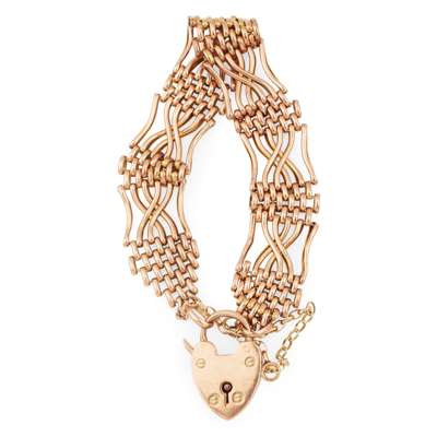 composed of stylized gate links, with heart shaped padlock stamped 9CT, with safety chain