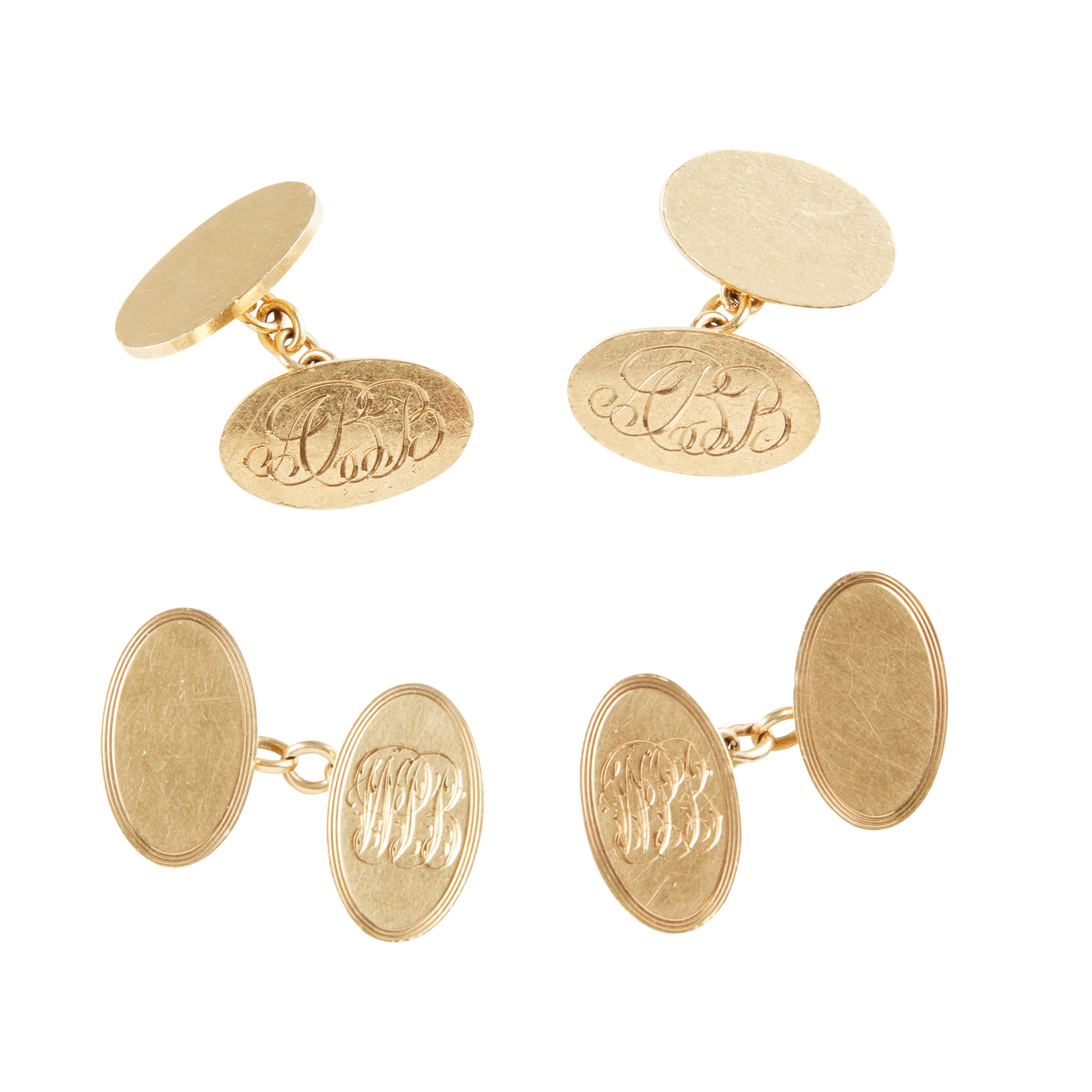 to include a pair of 9ct gold oval terminal cufflinks, with script initials and belcher links; together with another similar pair, stamped 9ct