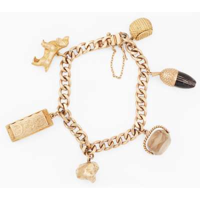composed of flattened curb links, with various charms including a solid 9ct spaniel charm, a woven basket, swivel fob, gold nugget etc
