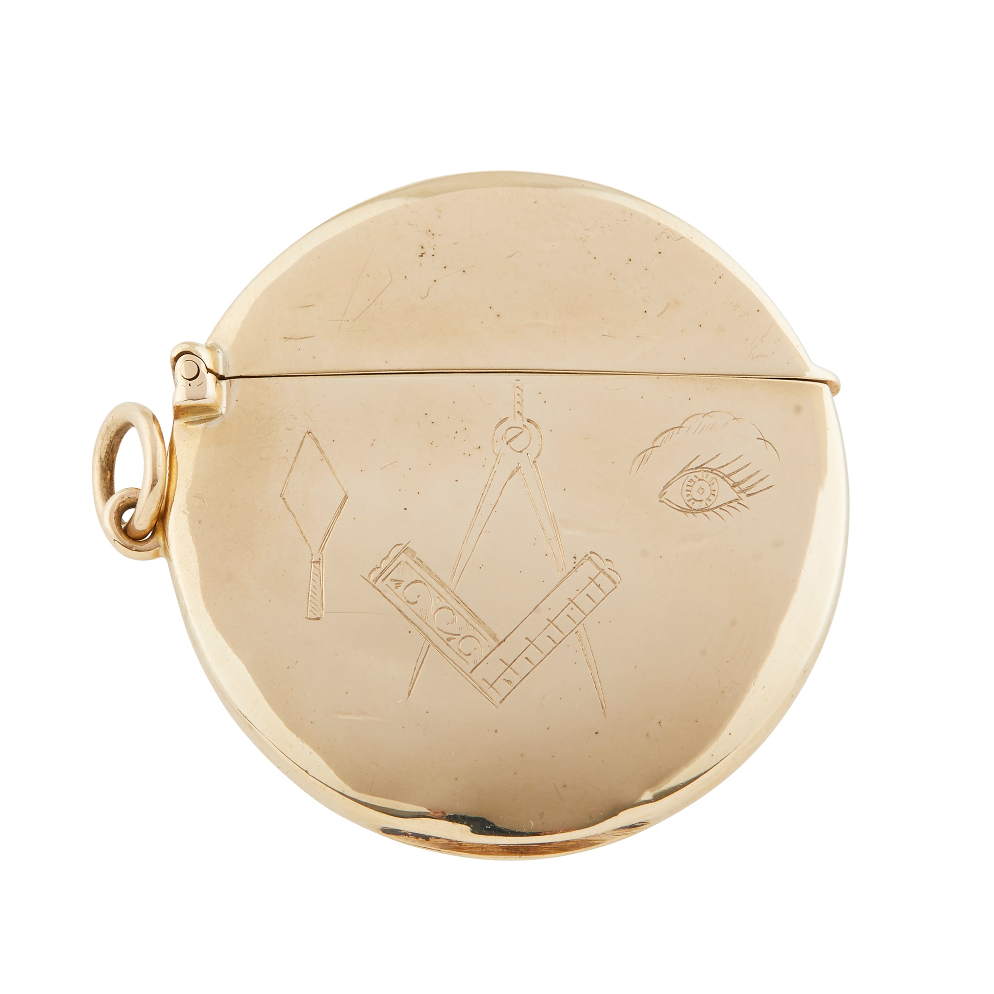 Sampson Mordan & Co Ltd, Chester 1910, of circular disc form, engraved Masonic symbols to front