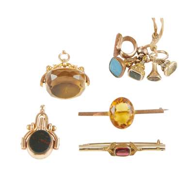 to include a 9ct gold citrine set swivel fob; a 9ct bloodstone swivel seal and a collection five seals with various matrices; together with a citrine set bar brooch and a synthetic ruby set bar brooch