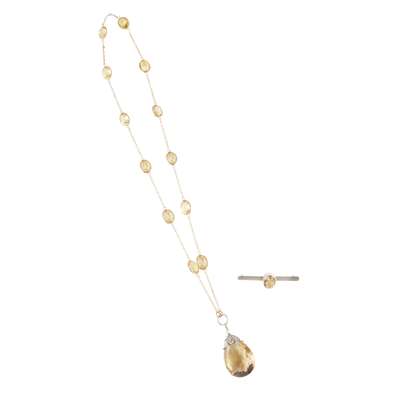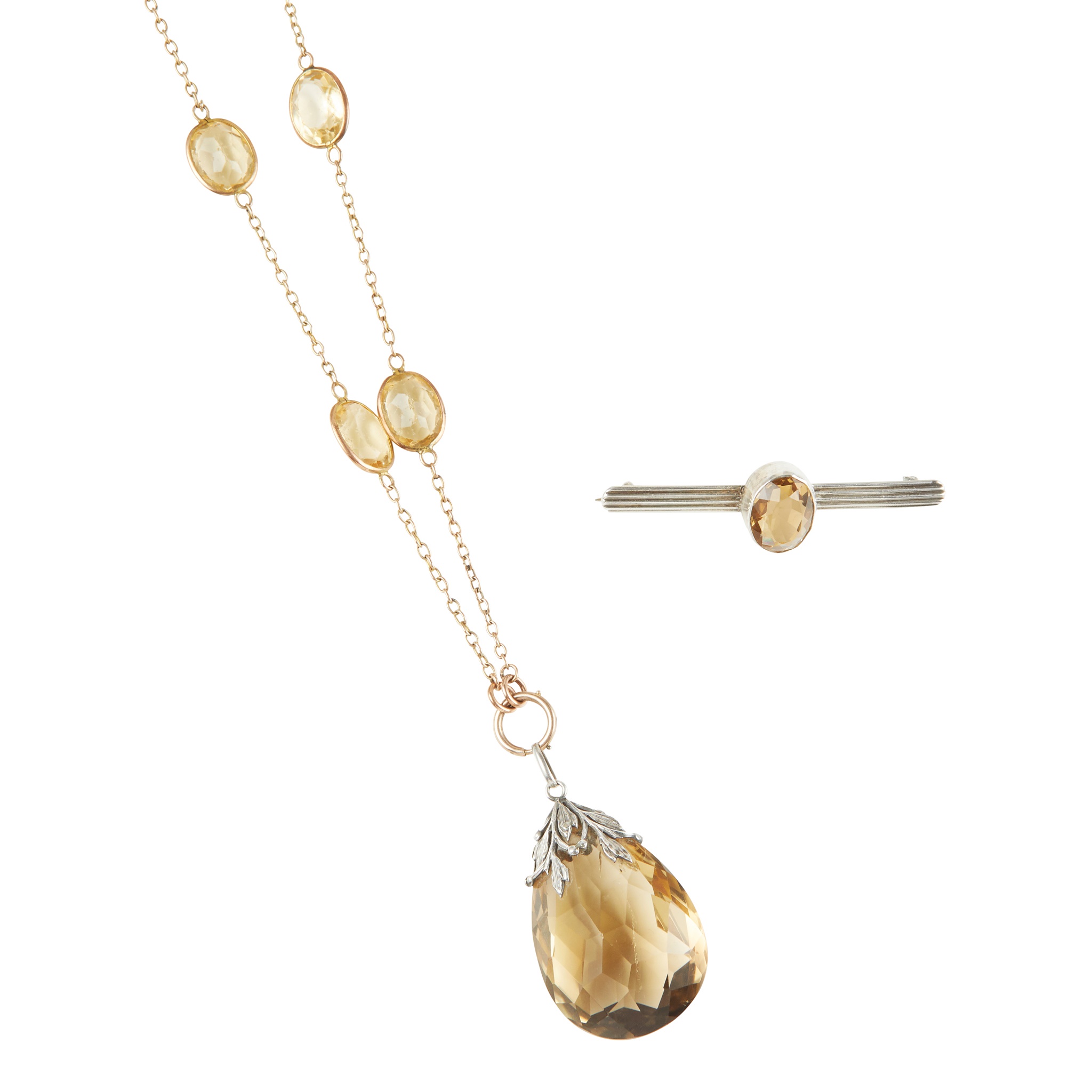 composed of a row of spectacle set oval-cut citrines, with a large briolette-cut citrine pendant, to an unmarked yellow metal belcher link chain; together with a citrine set bar brooch, collet set with an oval-cut citrine to an unmarked white metal bar brooch fitting