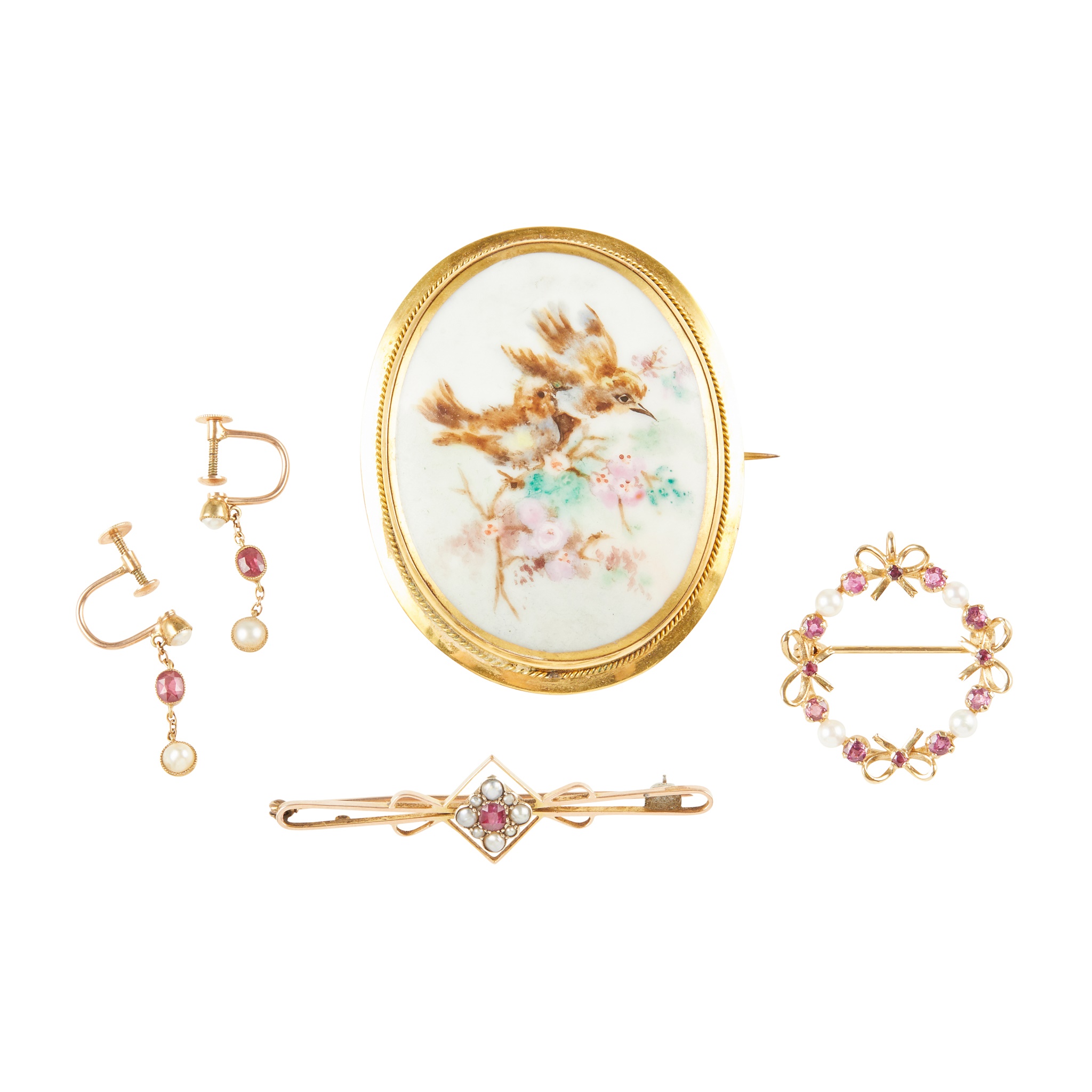to include a 9ct yellow gold ruby and seed pearl set wreath brooch; a ruby and seed pearl set bar brooch, stamped 9CT; together with a pair of ruby and seed pearl set pendant earrings, screw fittings and a Victorian oval brooch with enamelled bird detail