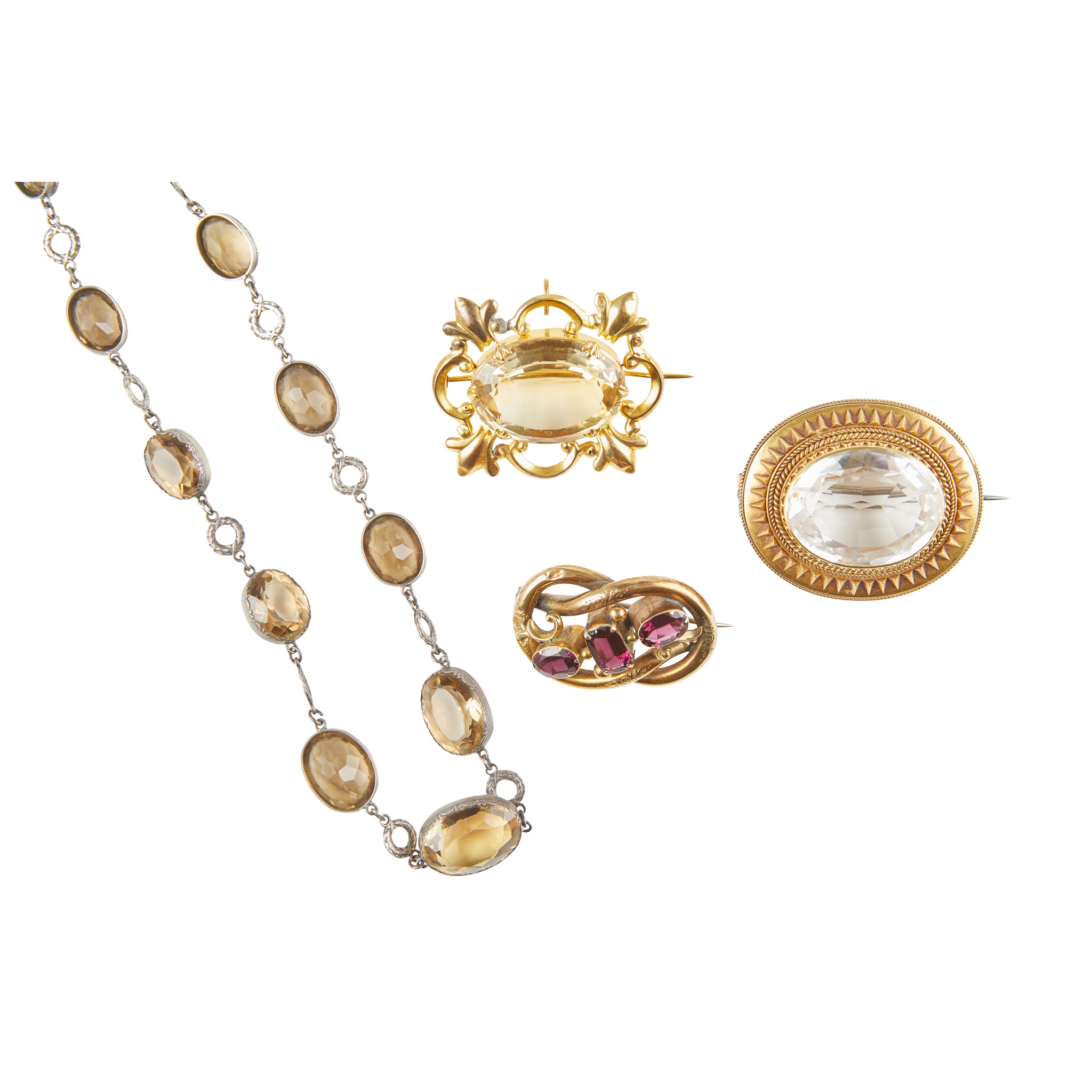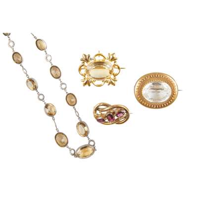 to include a claw set oval-cut citrine in a fleur-de-lys cast border, unmarked; an amethyst set brooch of intertwined form, unmarked and another, collet set with an oval mixed-cut rock crystal in a rope twist border; together with a citrine set necklace, composed of alternating wreath links and collet set oval citrine set links, unmarked