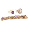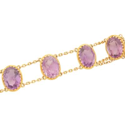 claw set with seven oval amethysts in a rope-twist border, joined by two rows of belcher links and a box clasp, stamped 9ct; together with an amethyst and diamond set three stone ring, and a pale amethyst set cocktail ring