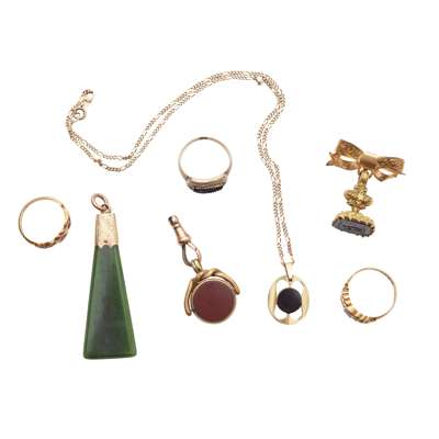 to include an 18ct gold ruby and diamond set ring, to a plain shank; together with a 15ct gold ruby and diamond set ring, a green hardstone pendant; a mourning ring mount (central panel missing), unmarked; an agate set swivel fob and another engraved pendant fob, a yellow metal and onyx sent pendant