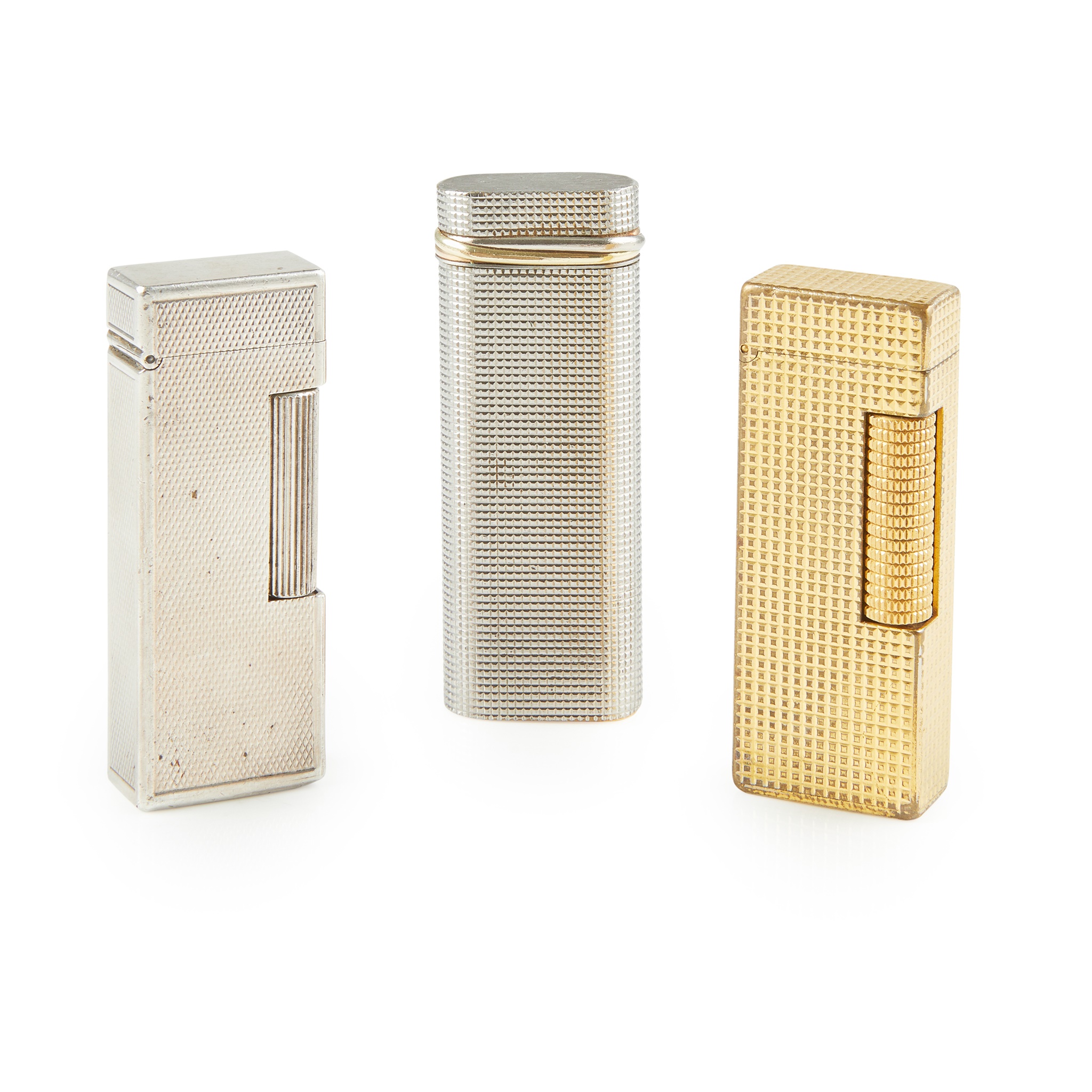 to include a Must de Cartier lighter, the textured body with gilt bands, in a Must de Cartier box with booklets; together with two Dunhill lighters, one silver with engine turned decoration, rectangular form; the other gilt example of similar style