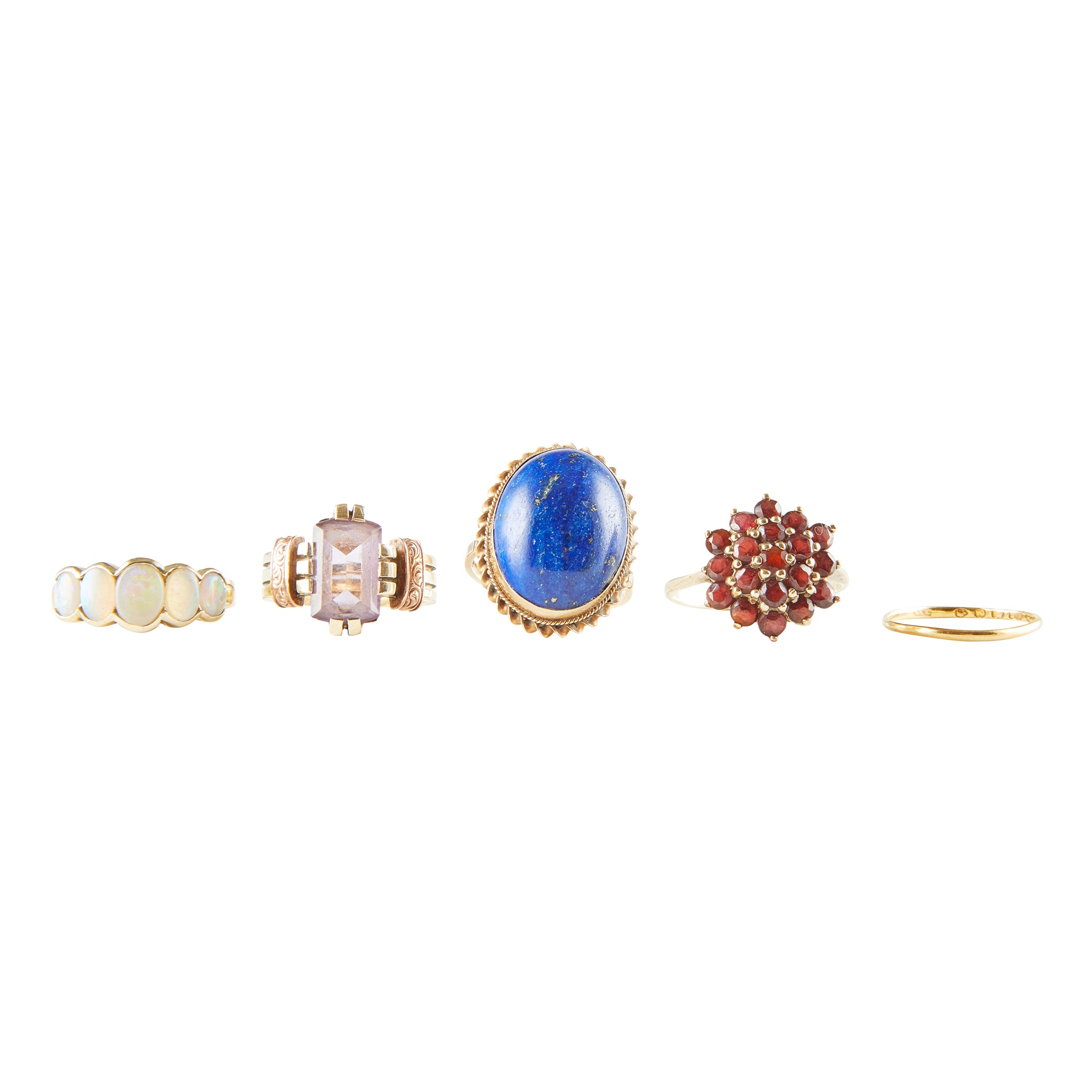 to include a 9ct gold ring set with an oval lapis lazuli cabochon in a rope twist border; together with a 9ct gold five stone opal set ring; a garnet set cluster ring, indistinctly marked; an amethyst set ring, engraved 1882 to inside of shank; a with a 22ct yellow gold wedding band
