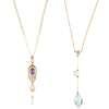 claw set with an old cushion-cut diamond, suspending two knife-bar links set with a single (untested) bouton pearl and an oval-cut aquamarine, to an integral unmarked yellow metal chain, unmarked, in a fitted box; together with a modern 9ct gold pendant, of scrolling Art Nouveau style, collet set to the centre with an oval amethyst cabochon and pearl drop, to a flattened-curb link chain, stamped 375 ITALY