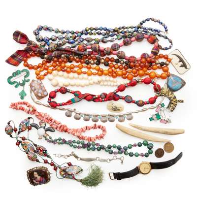 to include a malachite set brooch of scrolling design, modelled in an unmarked white metal; together with various beaded necklaces, including fabric covered, amber and imitation amber beads, an ivory bead necklace and a turquoise set necklace stamped SILVER; together with a collection of brooches, a Ruskin style brooch stamped SILVER, a Gucci wristwatch