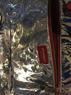 cream canvas and silver, red and black calf leather, metallic interior, interlaced chain and red leather strap, silver-toned hardware, dustbag