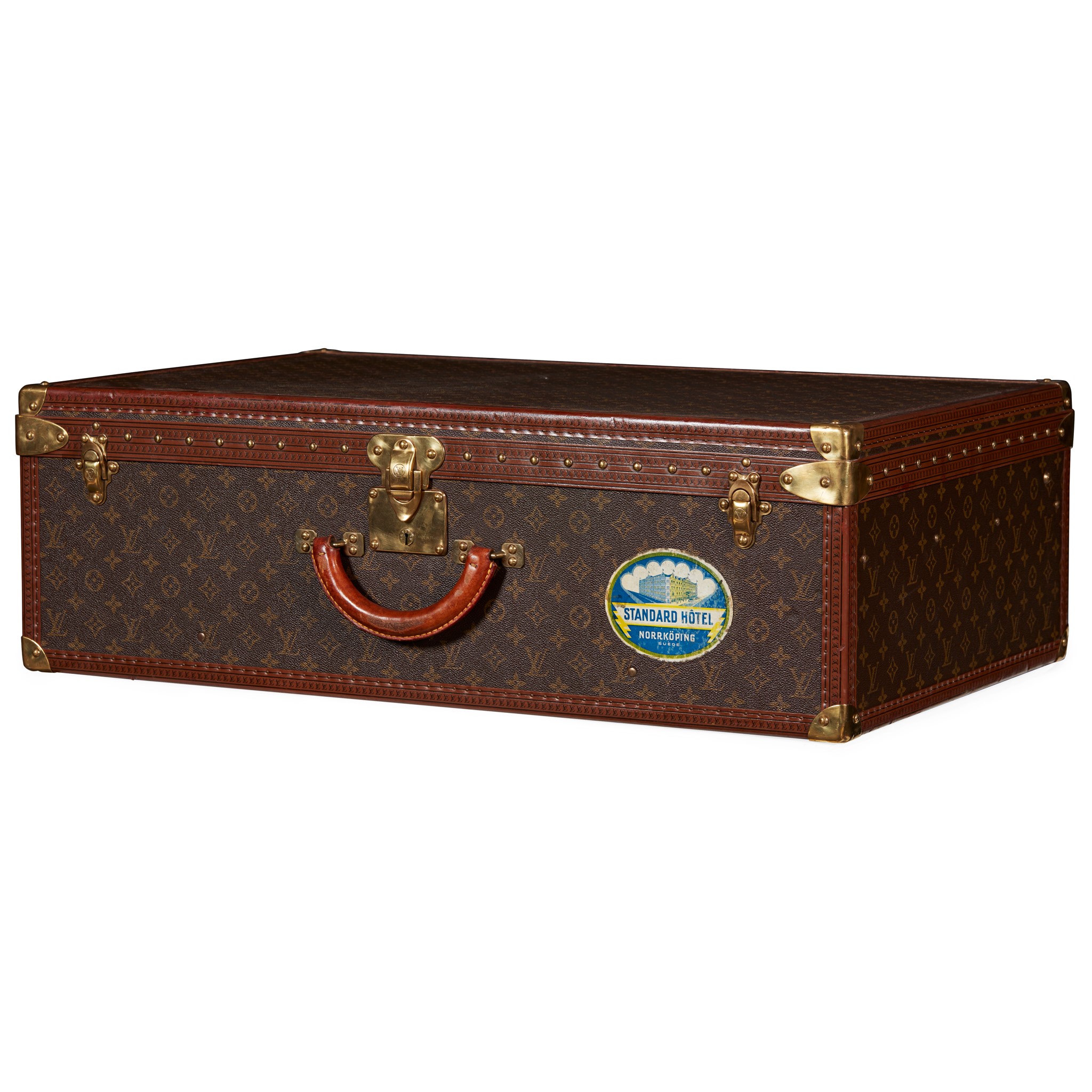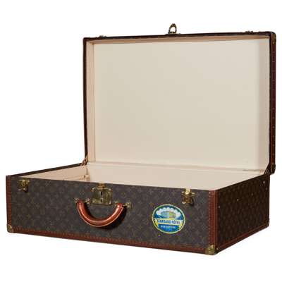 covered in signature monogram brown leather with stamped brass hardware, lined interior, serial no. 980636, with key; the exterior with travel labels