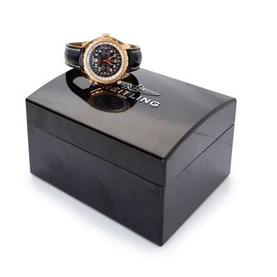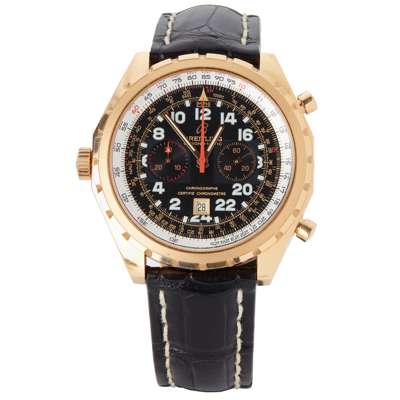 Chrono-Matic, Ref: H22360, limited edition 125/250, black dial with white lume Arabic numerals, date aperture at 6, outer scales in rose gold, silvered slide rule bezel with numerals in black, rose gold lume filled hands, red centre seconds hand, crown to the left with two push buttons to the right, automatic movement, on a signed Breitling black leather crocodile-effect strap, signed Breitling rose gold fold-over clasp, in box, no papers