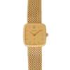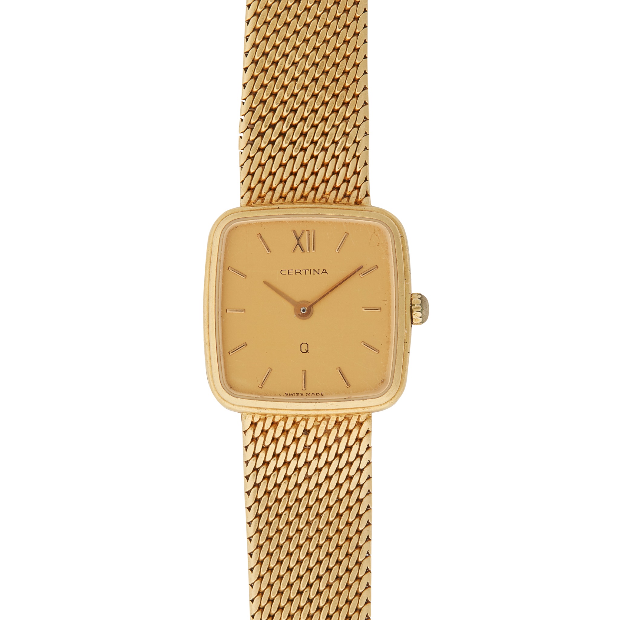 square champagne dial with applied gold baton hour markers, gold pencil hands, quartz movement, on an integrated woven bracelet, fold-over clasp with Certina logo, no box or papers