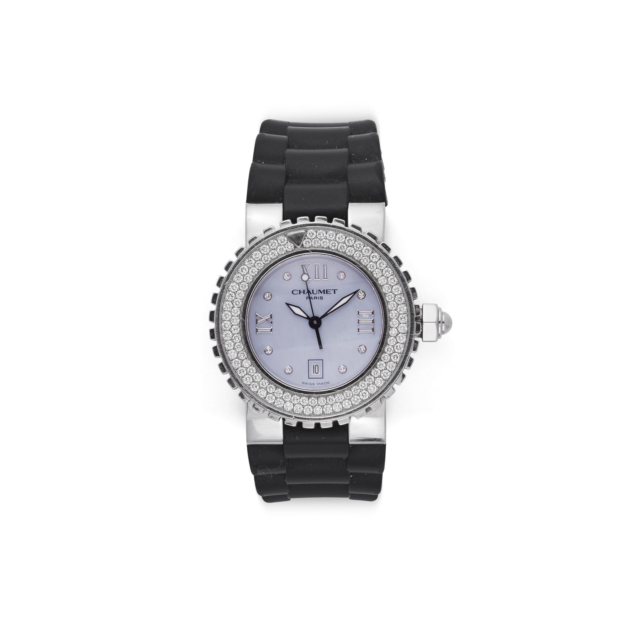 Class One, rotating pavé-set brilliant-cut diamond bezel, mother-of-pearl dial with diamond dot indicators and Roman quarters, date aperture, sweep second hand, black rubber strap, fold over clasp, signed Chaumet Paris, numbered