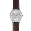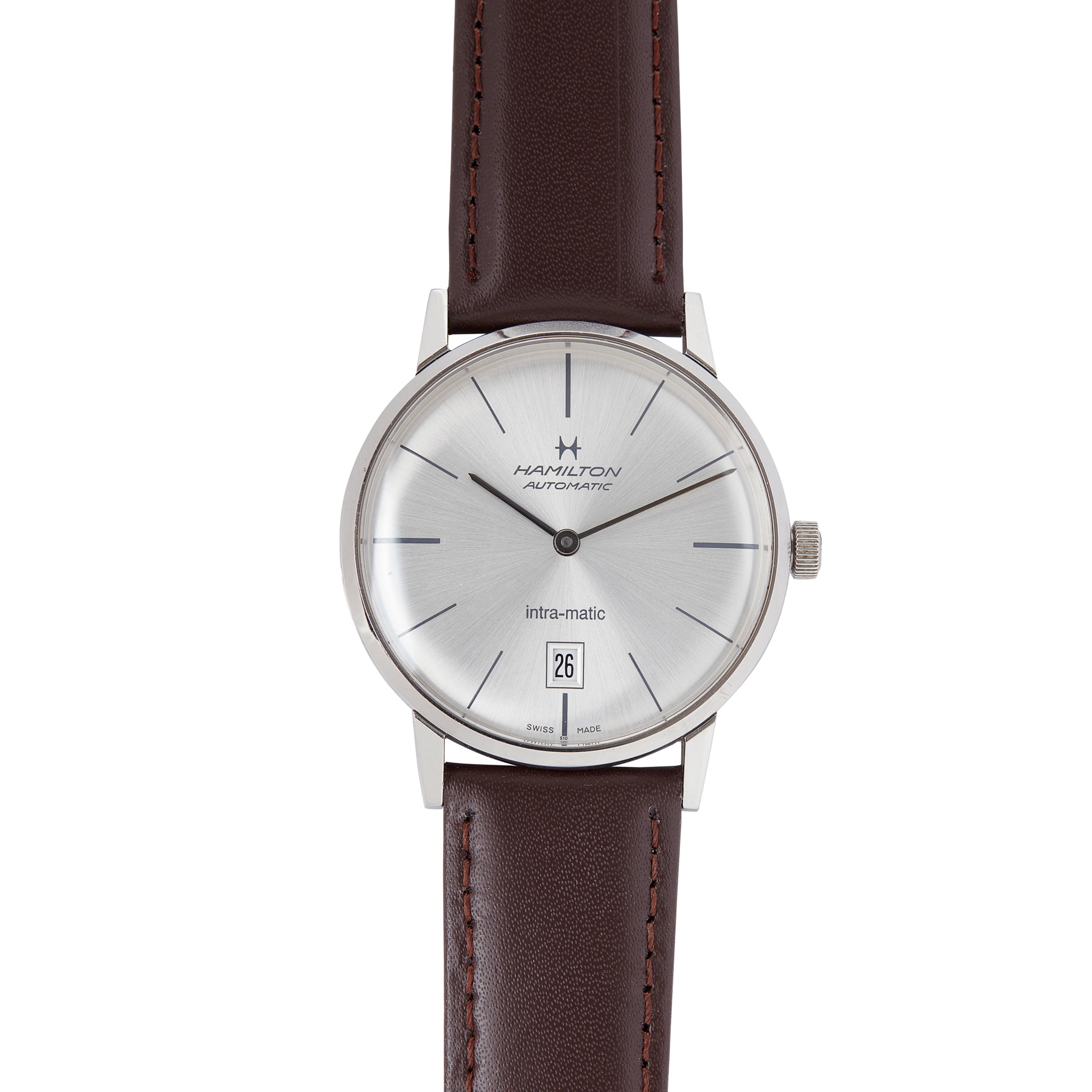 Intra-matic model, serial number H384550, plain brushed silvered dial, baton hour markers in black, date aperture at 6, pencil hands in black, skeleton case back revealing automatic movement, with H384550 and 2892-2 to the case back edge, on a generic leather strap, no box or papers
