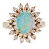 the opal cabochon claw set above a stepped double border of small round brilliant-cut diamonds, to a plain shank, stamped 585