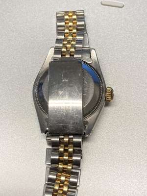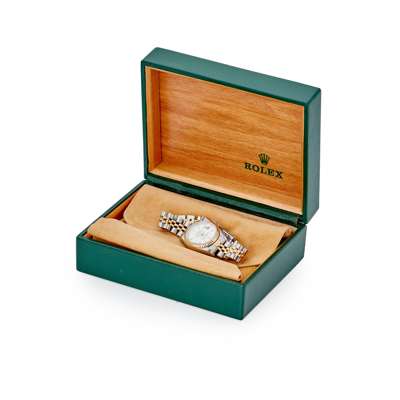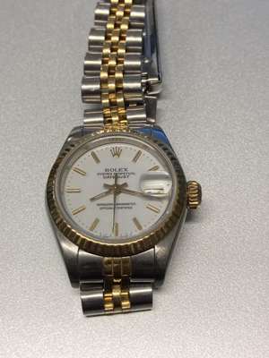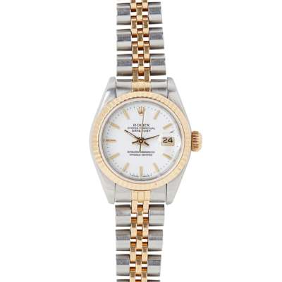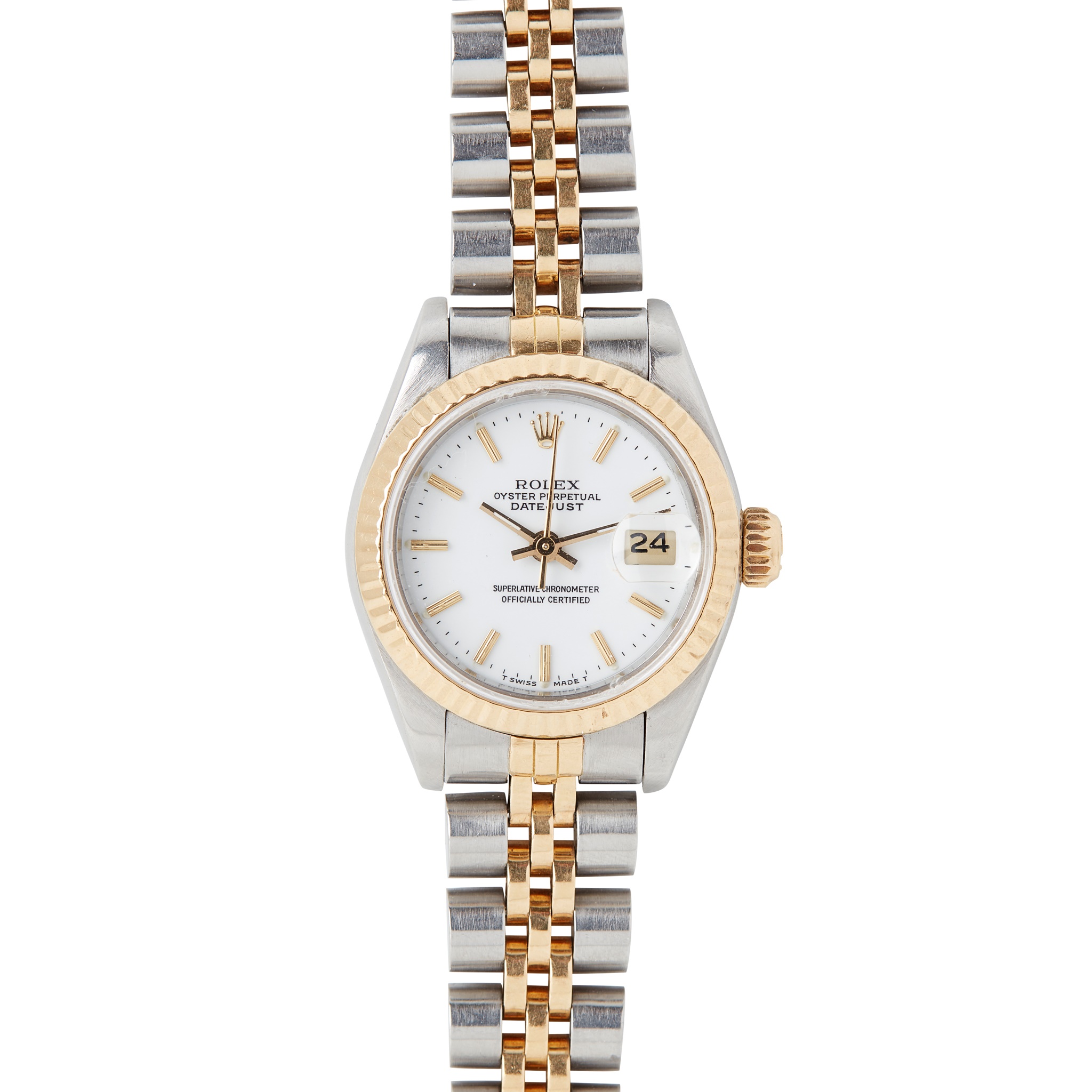 Oyster Datejust model 16030, round white dial, applied gold baton hour markers with coronet at 12, date aperture at 3, lume filled gold pencil hands, gold centre seconds hand, black outer seconds track, gold fluted bezel to the stainless steel case, gold screw down crown with coronet, automatic movement, case back with ORIGINAL ROLEX DESIGN STAINLESS STEEL, on a stainless steel and gold bi-colour jubilee bracelet strap with 468B to the end link, signed Rolex clasp numbered 62523D.18, L4, in box, with outer box, with papers