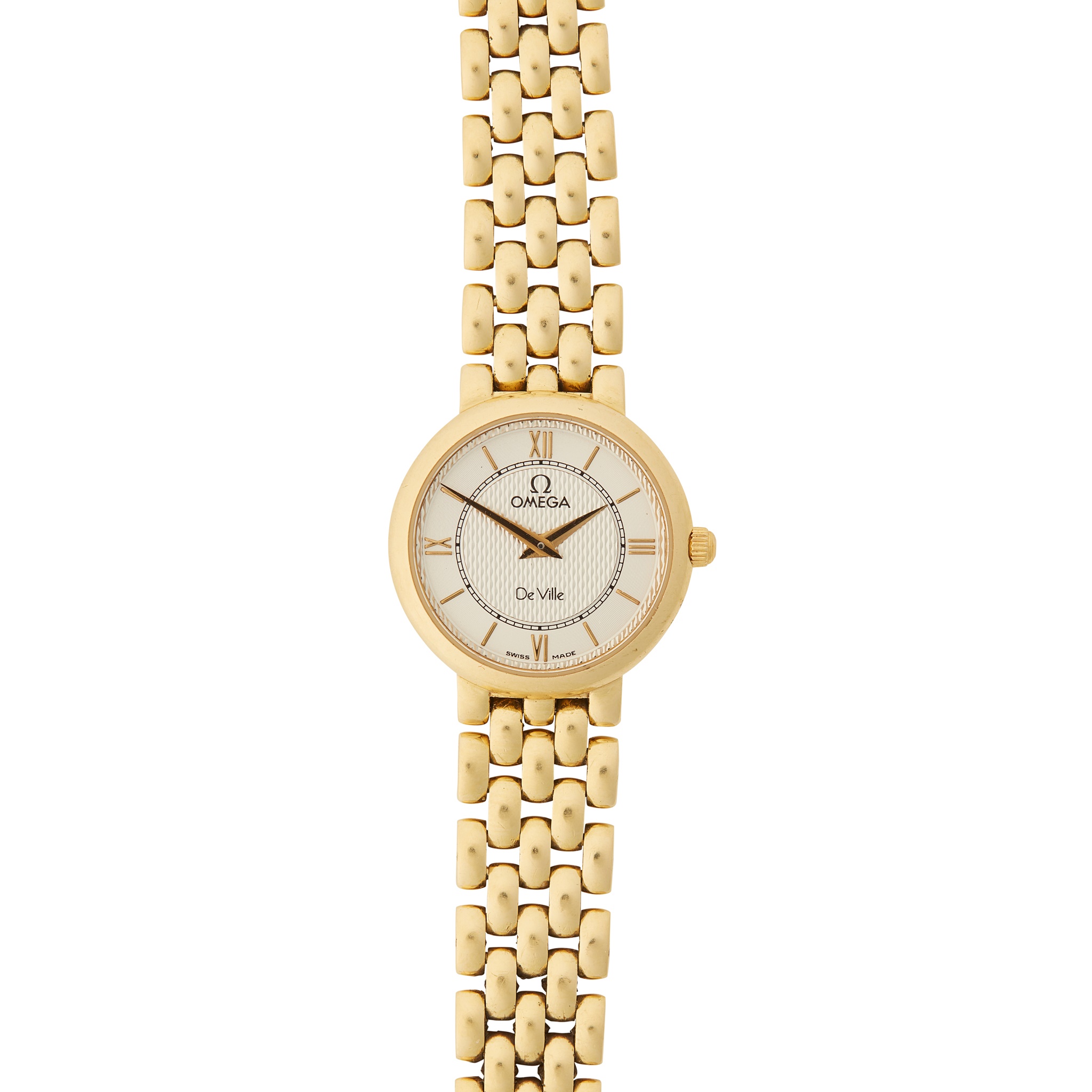 de Ville model, silvered guilloche dial with applied gold Roman numerals to the quarters and baton hour markers, inner seconds track in black, gold bevelled sword hands, the case back with de Ville city skyline logo, on a gold polished link bracelet with snap clasp, no box and papers