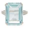 claw set with a large emerald-cut aquamarine, each shoulder set with five graduated eight-cut diamonds, to a plain shank, indistinctly marked