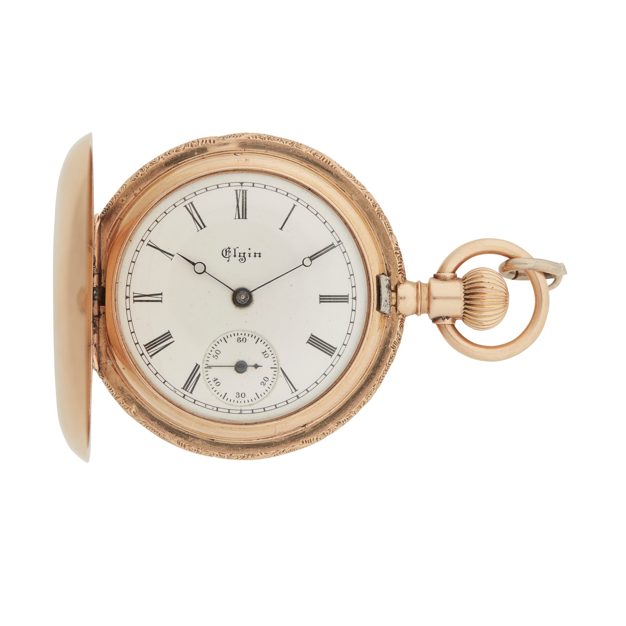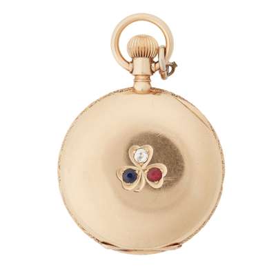 full hunter, keyless wind, the outer case with engraved clover leaf motif, each section gem-set, engraved detail to case edge, round white enamel dial with Roman numerals in black, sunken subsidiary seconds at 6, railroad outer seconds track in black, black Breguet style hands, signed Elgin movement numbered 3174404, the movement cover numbered 74526 188