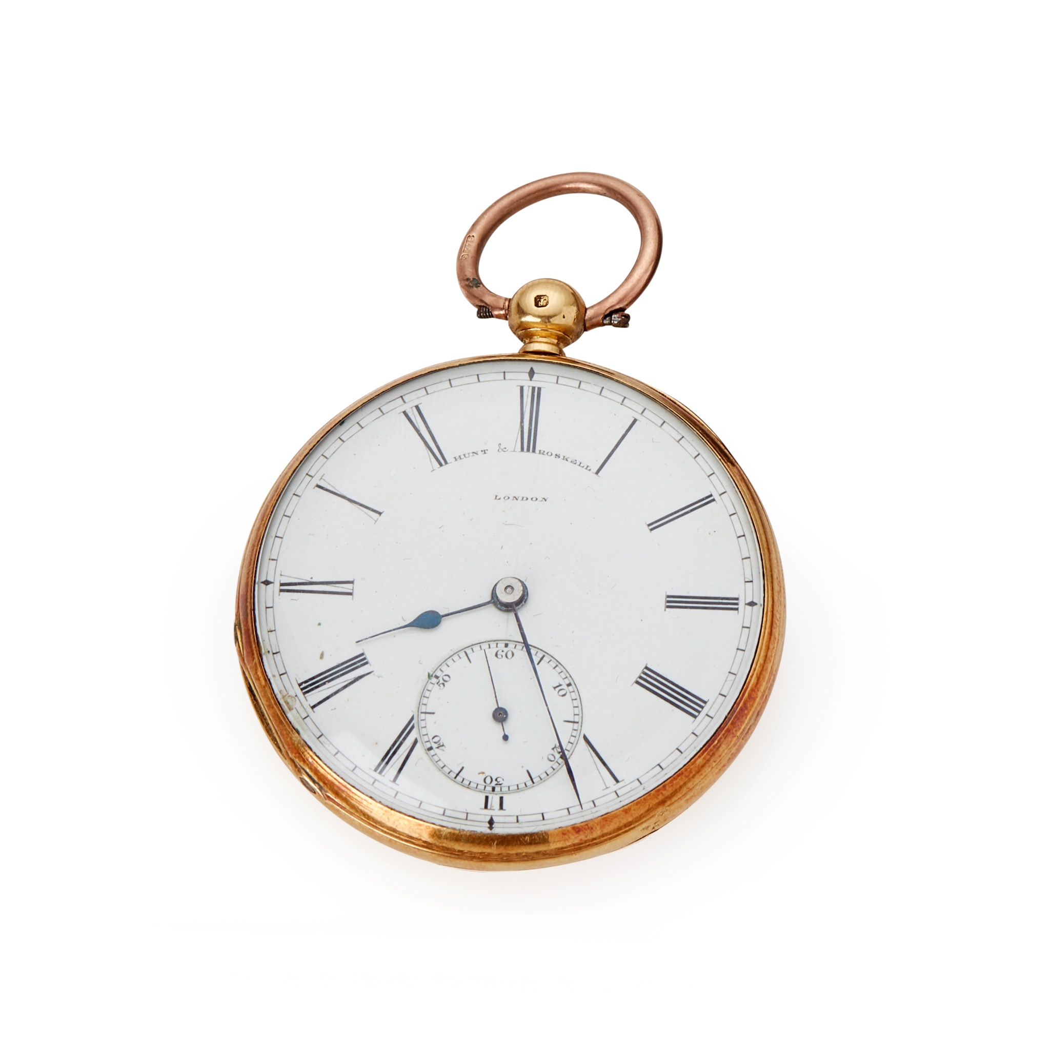 signed white enamel dial inscribed Hunt & Roskell London, with Roman numerals in black, sunken subsidiary seconds at 6, railroad outer seconds track in black, blued steel leaf hands, with full London marks for 1857