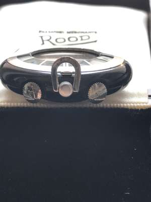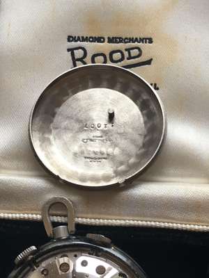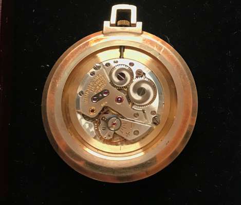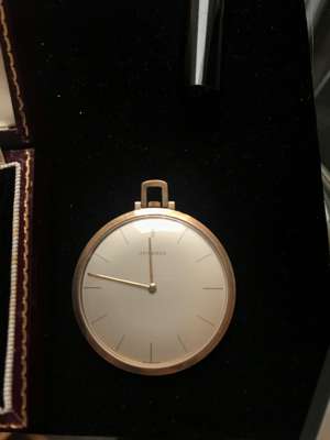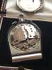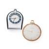 round silvered dial with Roman numerals in black, date aperture at 3, sunken alarm indicator dial to the centre, lume-filled black pencil hands, centre seconds hand in black, manual wind movement, rounded case with flat base to allow for upright display, case front with crystal aperture to view dial, with black enamel bezel surround with Roman numeral highlights, the case back with serial number, in a period leather case; a 9ct Juvenia slim open face keyless wind pocket watch, silvered dial with baton hour markers, gold pencil hands, in a period case