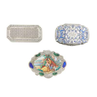 the first, stamped 800, of scalloped shape, inlaid with inset enamel faux malachite and lapis, with a painted Classical depiction to centre, with chased scroll detail to underside; together with French early 19th century table snuff box, with all over engine turned and other engraved decoration with blue enamel detail and a presentation table box from the Clothworkers Company of canted rectangular form, Carrington & Co, London 1934, all over engine turned decoration in the 18th century style
