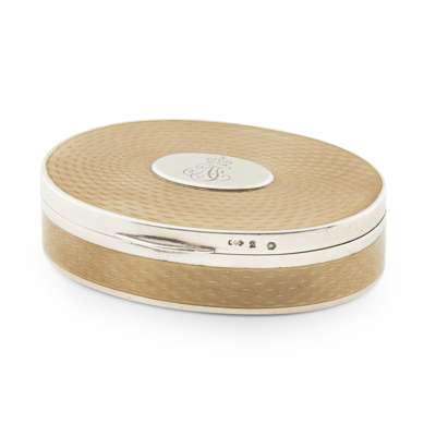 marked 900, of oval form, all over guilloché enamel decoration, applied oval cartouche to centre of hinged lid with engraved AF and crown surmount