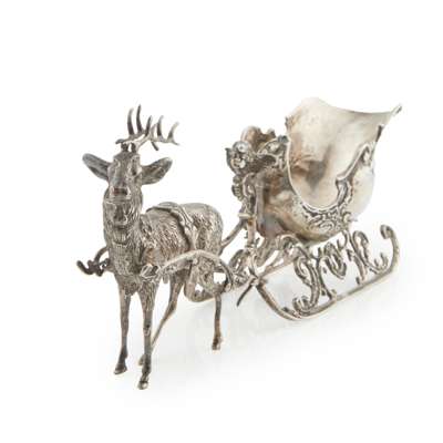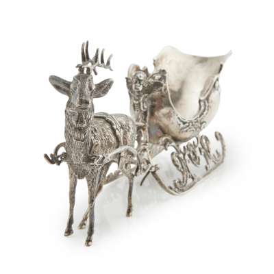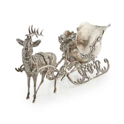 marked 800, the sleigh modelled as a Christmas sleigh with cherubic frontispiece, pulled by one reindeer naturalistically modelled