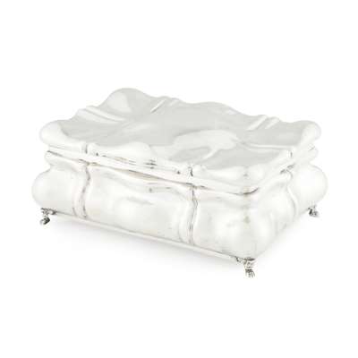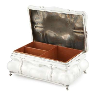 marked SM, with control marks for 800 standard silver, of moulded undulated rectangular form, with ribbed detail, raised on four paw feet, the wooden interior in three compartments, retail sticker to underside, 'Schulz/ Budapest'