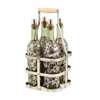 with four green glass bottles with grape vine overlay variously labelled 'ANISETTE', 'CHARTREUSE', 'CURACAO', AND 'FINE CHAMPAGNE', with cork stoppers; in a four compartment openwork stand with ivory handle