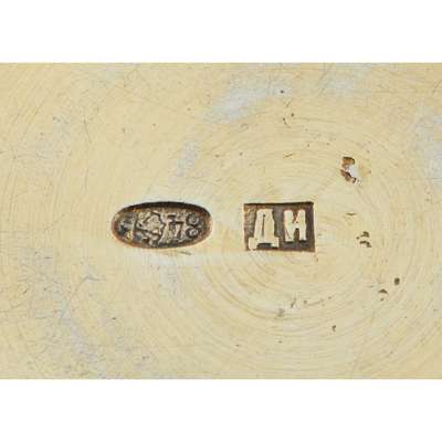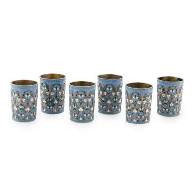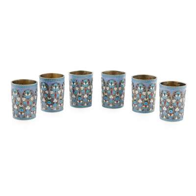 Kokoshnik marks to underside with maker's mark, circa 1899-1908, each of slightly tapered cylindrical form, with cloisonné enamel-work in shades of lilac, blue, red white etc.