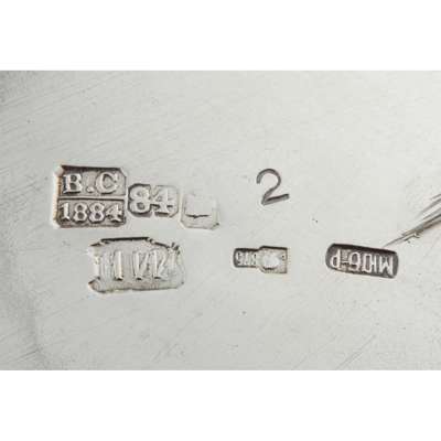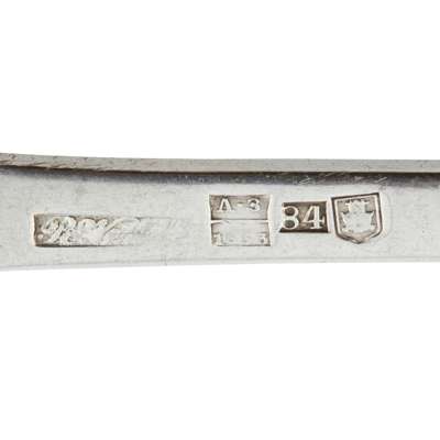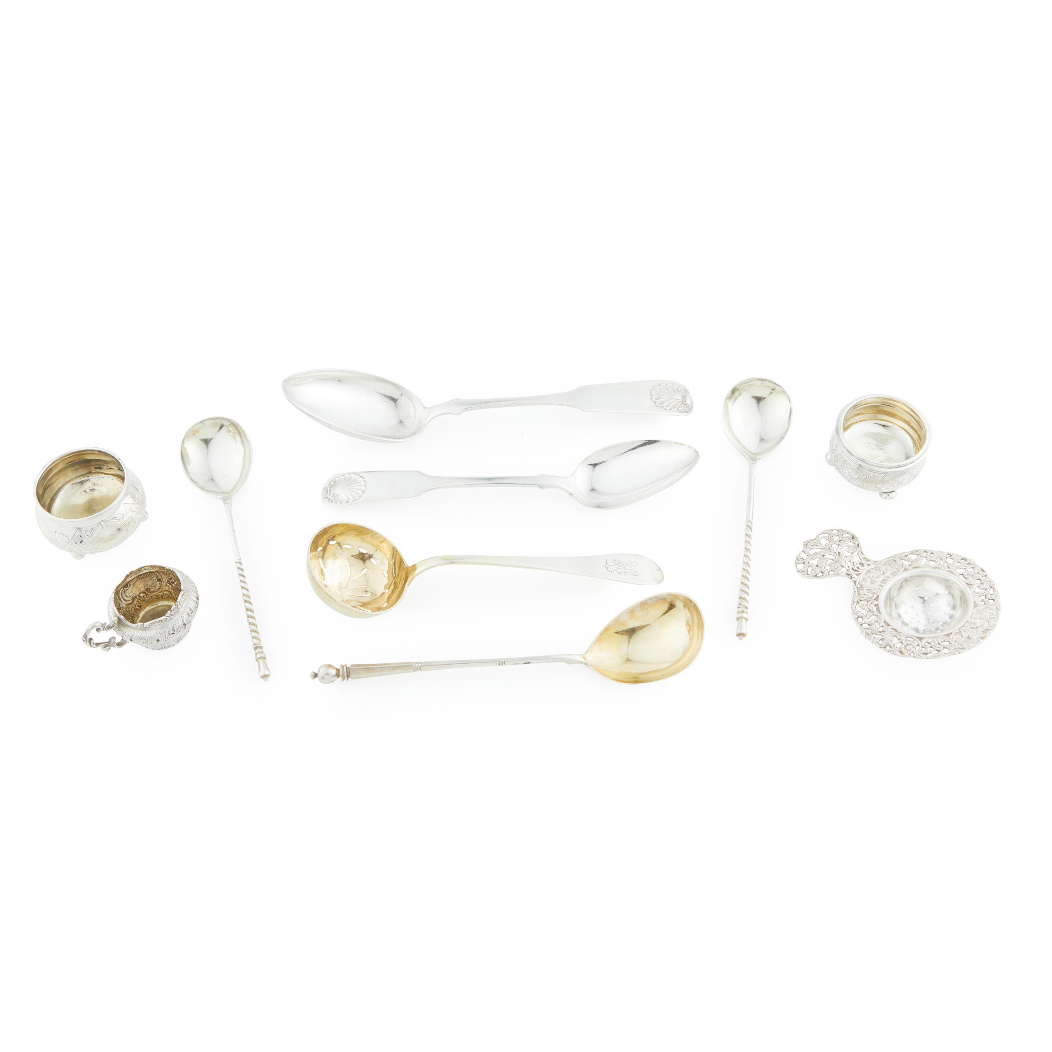 various marks, to include a tablespoon and dessert spoon of Fiddle and Shell pattern, a straining spoon; another spoon, with gilt fig shaped bowl and engraved scroll detail to reverse; together with a pair of salts, tea strainer (unmarked) and two spoons with niello detail to the rear of the bowls