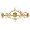 of scrolling design, set throughout with small seed pearls and three graduated round-cut peridots, stamped 15CT; in a tooled red leather box by West & Son ... Dublin