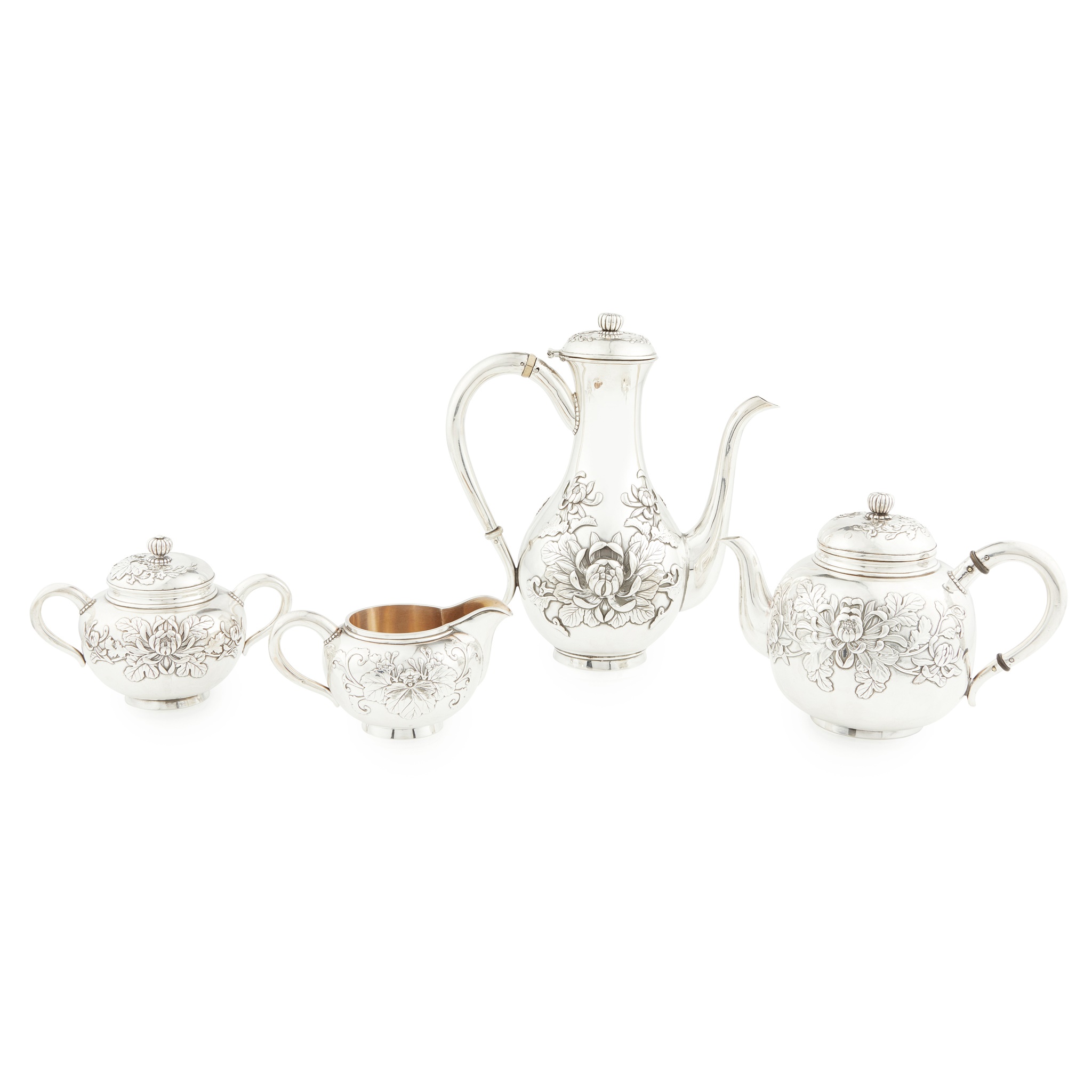 stamped STERLING, ARTHUR & BOND/ YOKOHAMA, comprising coffee pot, teapot, twin handled lidded sugar basin and a milk jug, all of globular form, embossed chrysanthemum decoration to bodies, the handles of scroll form, the lids with similar decoration and bud finials, all raised on a circular foot