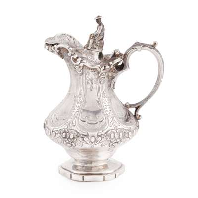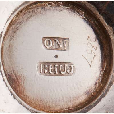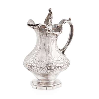 OomersiMawji, Bhuj, Cutch, mid-19th century, two marks O.M, BHUJ, of lidded form with oriental figural finial to a baluster hexagonal panelled body, all-over engraved and chased decoration, spreading foot