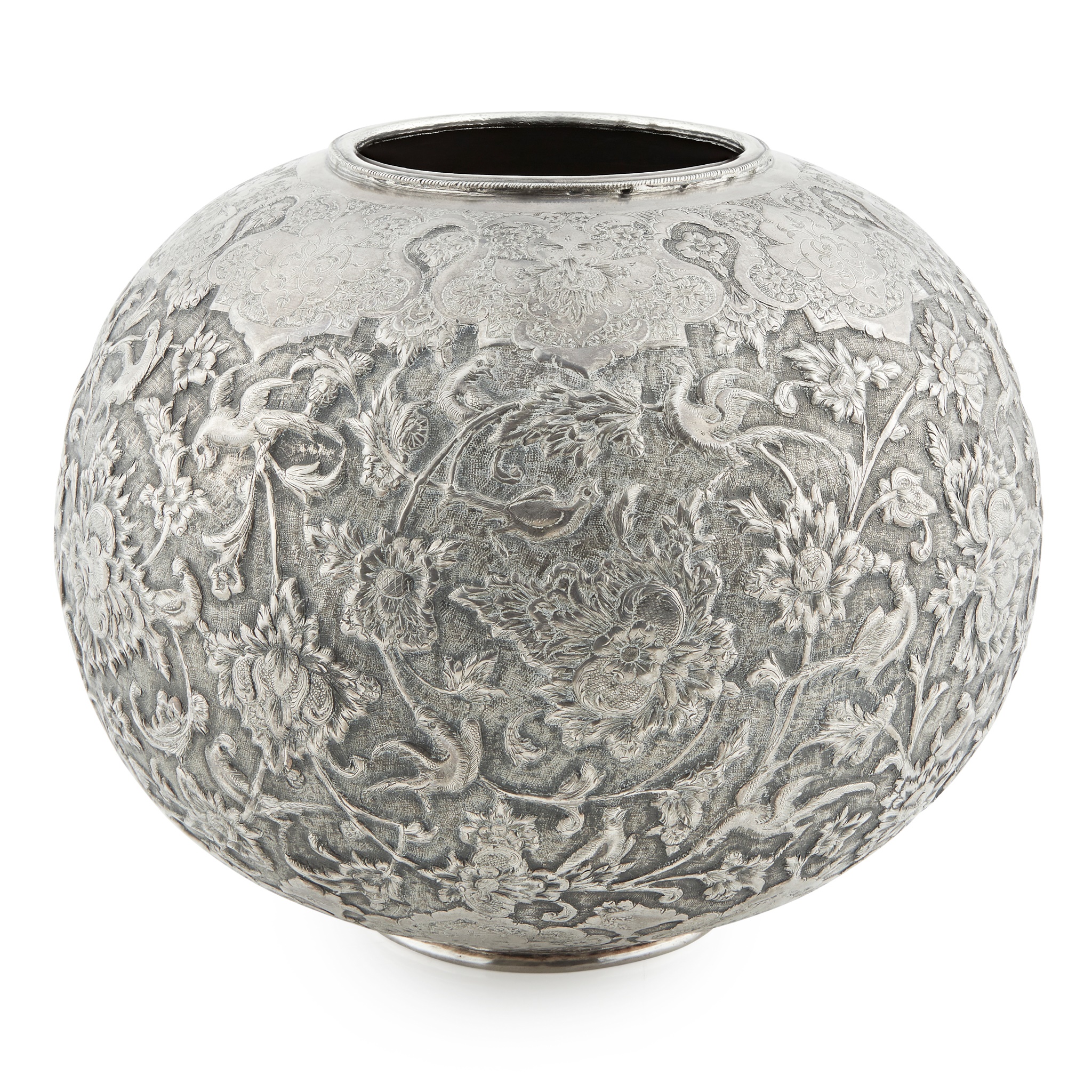 marked to underside, of globular form with all over embossed decoration featuring peacocks, chrysanthemums and foliage, the rim engraved with foliate motifs