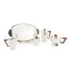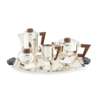 Germany, comprising a coffee pot, teapot, covered sugar bowl, cream jug, of rounded cylindrical form with tapered square bases and teak handles, and an associated tray with ebonised handles