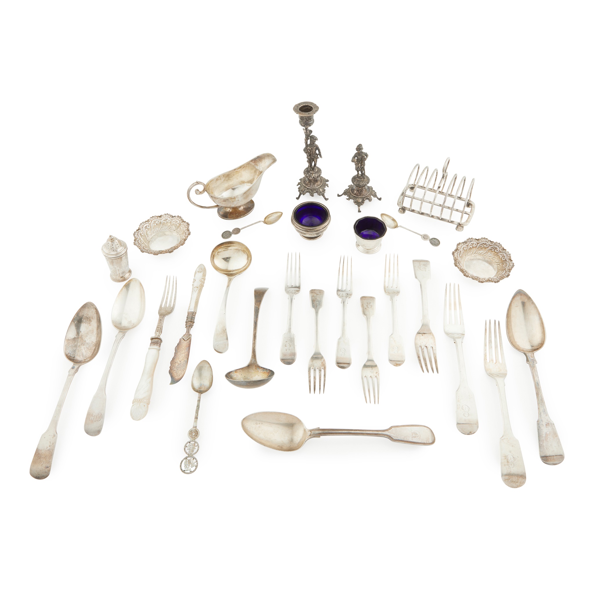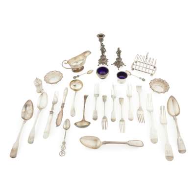 to include a seven bar toast rack, GH, Sheffield 1962; together with a collection of Fiddle pattern flatware, London comprising, three tablespoons, three table forks, five dessert forks with one Fiddle and thread tablespoons and two sauce ladles; together with a sauce boat and a pair of Scottish pin trays, Hamilton & Inches; together with various condiments, flatware and a pair (one damaged) of Continental candlesticks