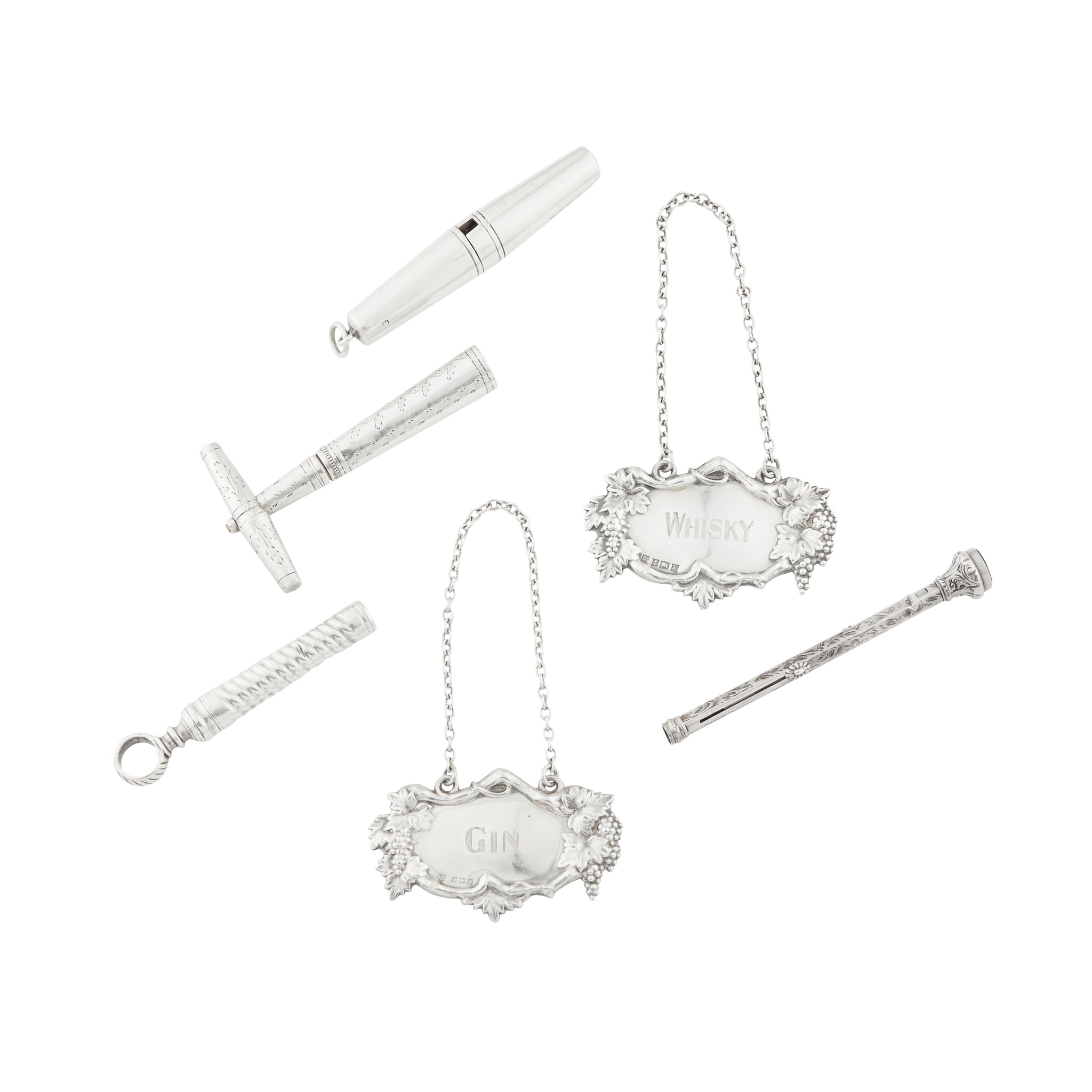 to include; a pair of spirit labels, Birmingham 1953, stamped shaped panel form, grape and vine border, engraved for Gin and Whisky, a group of three silver cased pocket cork screws, the first of torpedo form slight threaded border G&G, Chester 1899; another 19th century, maker's mark only, WP conjoined, tapering form, simple line engraving; the third of ring handle to the screw and screw off cover, wrythen detail, maker's mark only, probably European