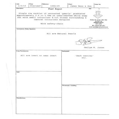 composed of a single strand of graduated natural pearls, the clasp set with an old marquise-cut diamond in a border of eight-cut diamonds, unmarked; with accompanying report dated 01.03.2012 stating that all are natural pearls