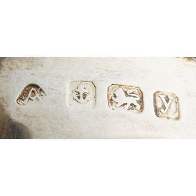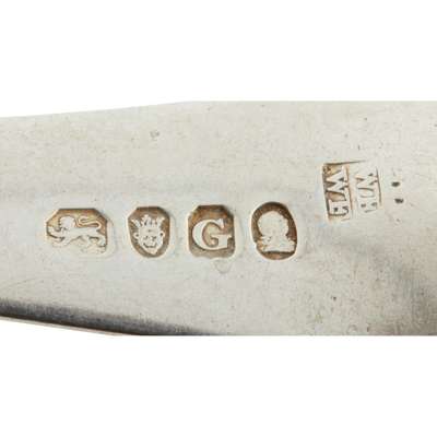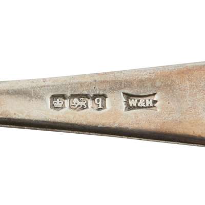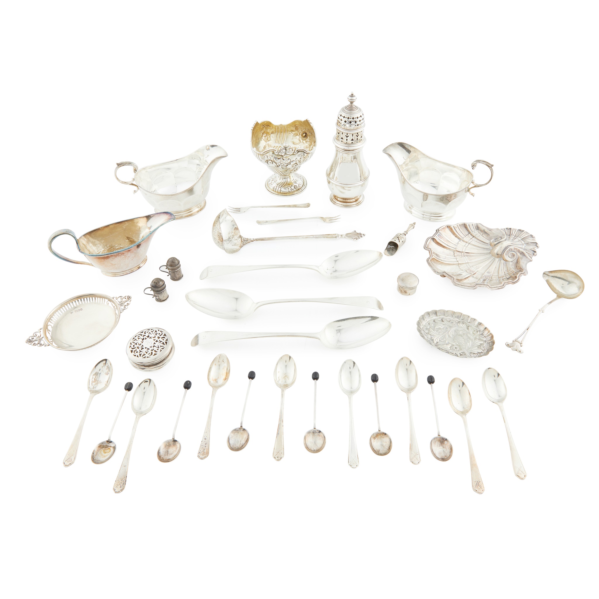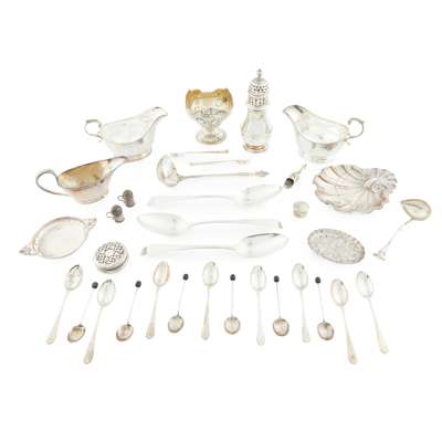 to include; a pair of sauce boats, Adie Bros, Birmingham 1923, of lobed form, with leaf clasped S scroll handles; three George III tablespoons, London 1802, of Old English pattern, engraved G to terminal; a shell butterdish; a modern caster Adie Bros, Birmingham; a sugar basin, London; a cased set of six teaspoons, golf club motif to terminal and a cased set of six coffee bean spoons; together with a sauce ladle by Jensen, of Acanthus pattern circa 1917 and another smaller, variant pattern and a collection of condiments, taster, pickle forks and a plated sauce boat