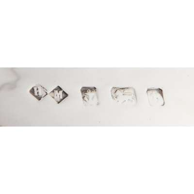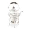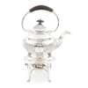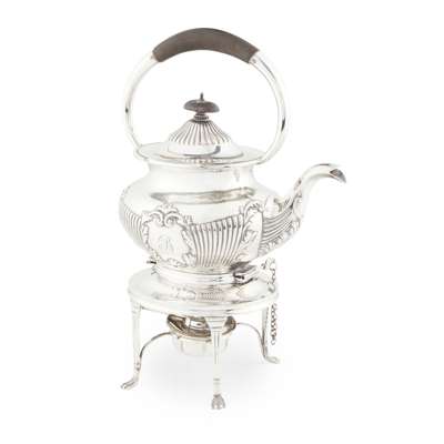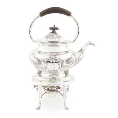 Henry Moreton, Birmingham 1918, the oval body of demi-fluted form, with vacant oval cartouche to one side of body and italic B engraved to the other, leaf clasped scroll handle and domed hinged lid, the stand with tapered Corinthian column legs to paw feet, with burner and chains