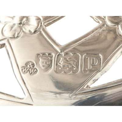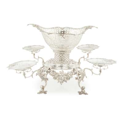 Wakely & Wheeler, London 1910, the large central bowl of moulded oval form, with a cast beaded and floral bud border of undulating form, the body pierced throughout with various motifs, the central stand with a cross-hatch floral stem, with a cast floral, foliate and budding swags to the four legs each radiating with scroll and leaf clasped branches, each with a circular dish with beaded borders, the feet each with similar scroll and foliate cast detail