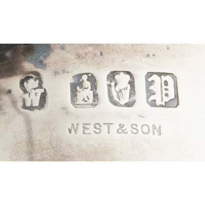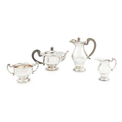 West & Son, Dublin 1910, comprising water pot, teapot, twin handled sugar basin and milk jug, all of circular form with slightly everted cast scalloped edge, the bodies of baluster form, with S scroll handles, raised on a stepped circular foot