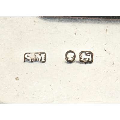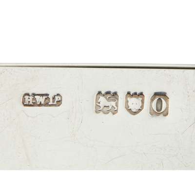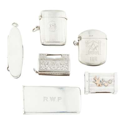 to include, a curved rectangular vesta case, Henry Williamson Ltd, London 1909, hinged lid, RWP engraved to centre the striker to the reverse of the body; another of slim line form with Masonic emblems and another Birmingham 1910, of rounded square form, with bright-cut decoration and LAW to a circular cartouche; together with a mixed metal match box cover, small vesta case and pocket knife