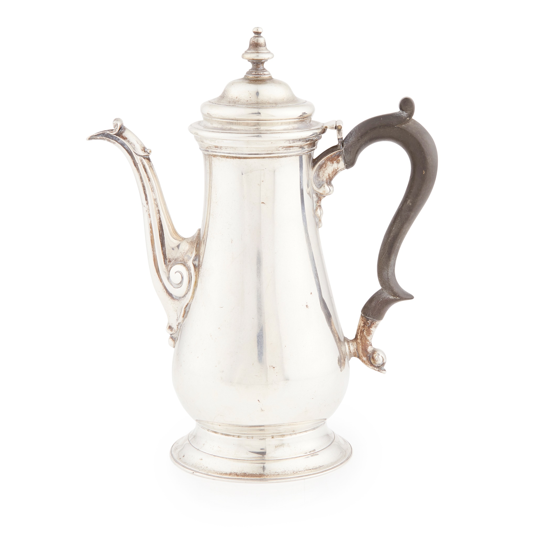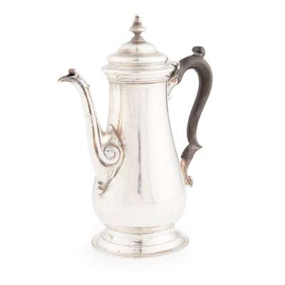 Skinner & Co, London 1908, of plain Georgian baluster form, scroll spout, the hinged lid of domed form with knopped finial, the handle of S scroll form, raised on a stepped circular foot