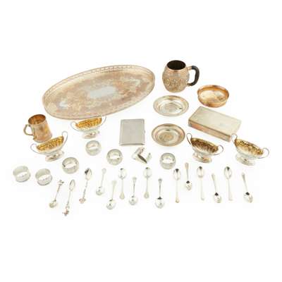 to include a cased set of four salts, Henry Matthews, Birmingham 1902, each of oval form with fluted and beaded bodies; together with a collection of Indian silver; a cased limited edition royal plate to commemorate the silver jubilee of Queen Elizabeth II with feature hallmarks, 1977; together with a table cigarette box and case, a collection of napkin rings, cased teaspoons, christening mug and a plated tray