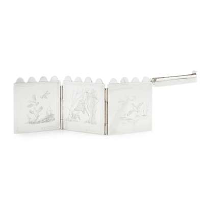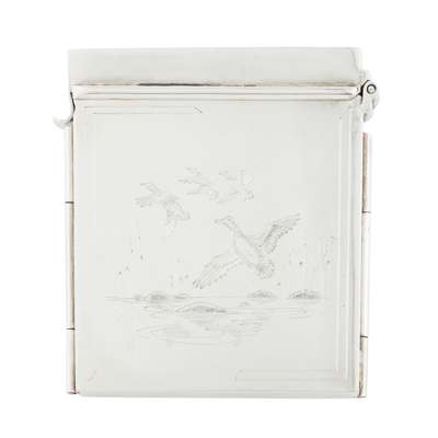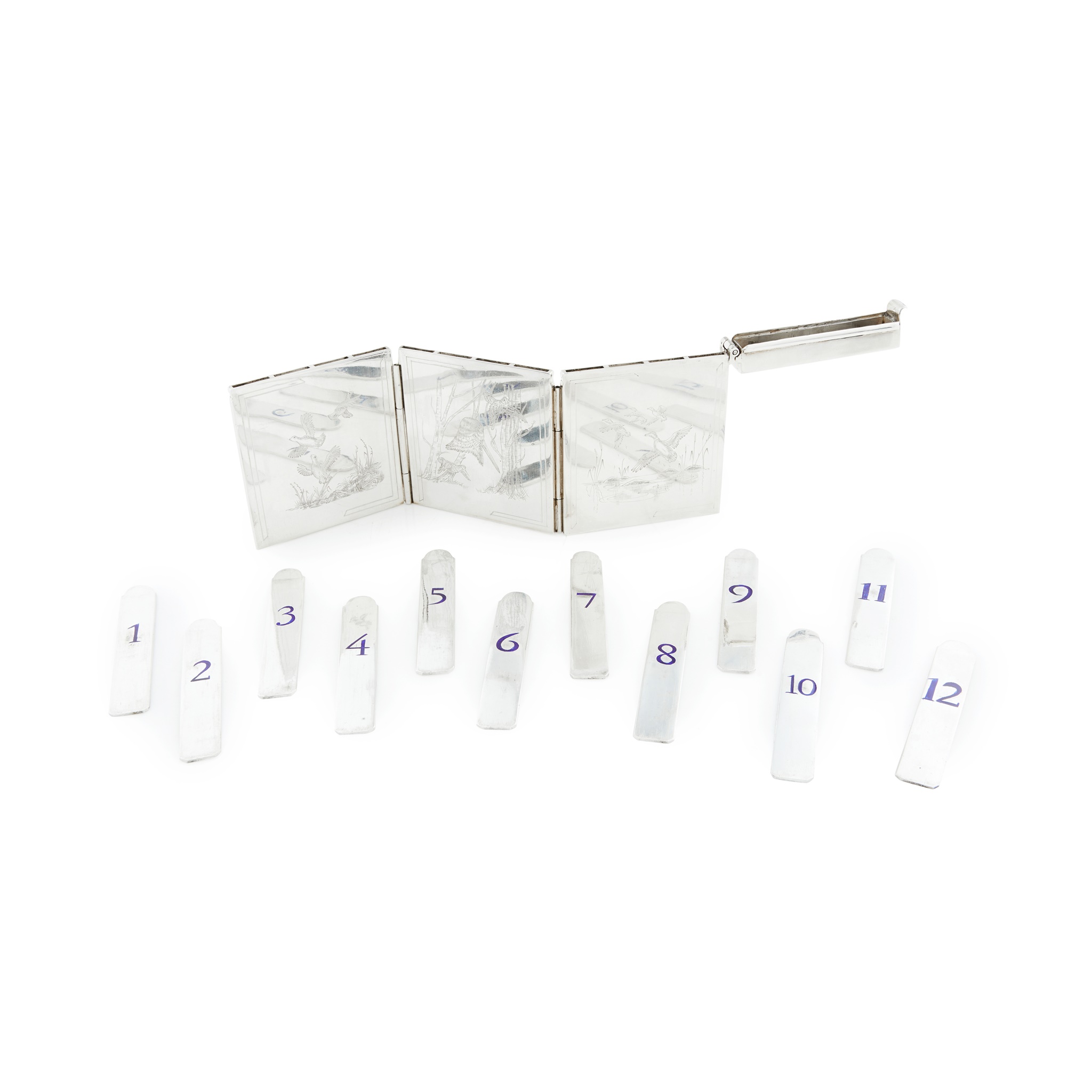 JJB, Edinburgh 2010, of heavy gauge the three fold hinged design with Royal arms engraved to front and three scenes of game birds to panels, with twelve numbered and enamelled pegs